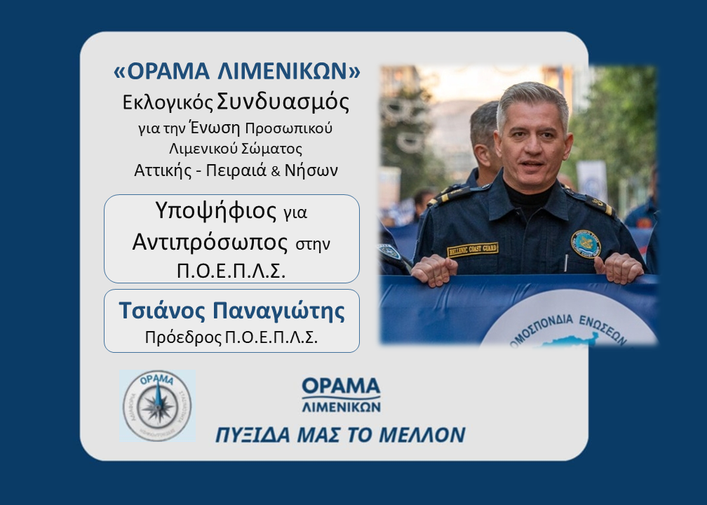 – Το «ΟΡΑΜΑ ΛΙΜΕΝΙΚΩΝ» είναι η καθαρή επιλογή εάν θέλουμε να έχουμε μια καθαρή εκπροσώπηση στην Ένωση Προσωπικού Λιμενικού Σώματος Αττικής, Πειραιά & Νήσων.